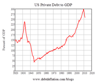 Thereafter, US private debt fell almost linearly for more than a decade, i.e., throughout the Great Depression, and throughout the war years, reaching a low of less than 50% of GDP in 1945.